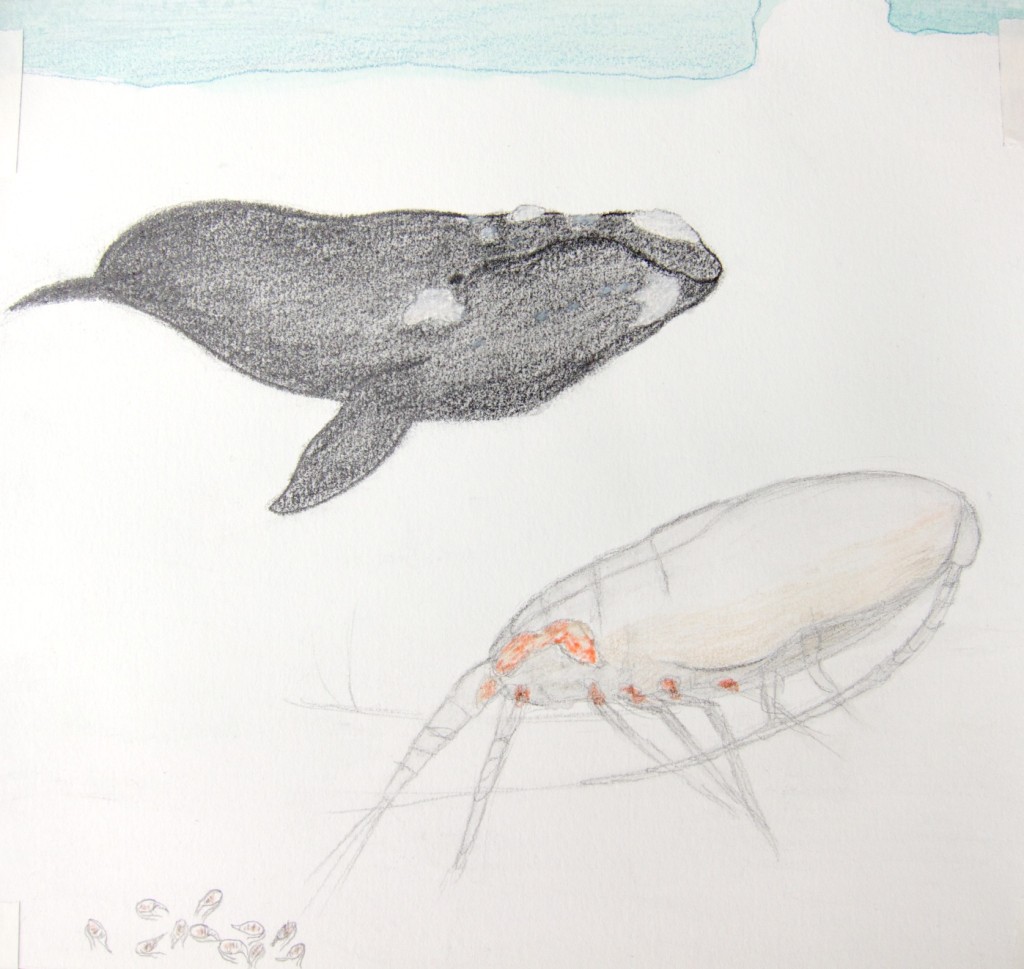 Colored pencil and water soluble graphite Bowhead whales eat mostly zooplankton, especially tiny copepods that they strain from the water, up to 10,000 in one mouthful! I was playing around with scale (in reality copepods are barely visible to the naked eye and whales of course are enormous), ways to draw copepods, and the idea of life under the ice. Different elements of this little sketch might eventually become their own pieces, but this was just a fun way to get down some ideas. The pile of tiny copepods at the bottom of the paper is in reference to the fact that some copepods essentially hibernate in big clusters in very deep water over the winter and live off oil reserves in their bodies. I was lucky enough to get to look at some live copepods under a microscope the other day thanks to Dr. Carin Ashjian, so now I’m experimenting with different ways of portraying them. 6 Responses Michael Mangalo May 26, 2014 Wow! I think it’s really cool how with just a piece of paper, a coloured pencil, and graphite, you can show the similarities between two creatures that are so drastically different in size! What exactly is a copepod and why did you choose to portray these creatures next to this enormous bowhead whale? Reply Chelsea Clarke May 28, 2014 Thanks for the compliment! A copepod is a type of zooplankton, a tiny sea creature sort of like a very miniature shrimp. I drew it with the bowhead whale because believe it or not tiny copepods are the main source of food for these whales! They strain thousands of them out of the water with their baleen. Reply Michael Mangalo May 28, 2014 Cool! That’s very interesting that they look so alike. So if they eat zooplankton, are zooplankton higher or lower in the food chain than phytoplankton? Do any whales eat phytoplankton? Coastal Alaskan June 3, 2014 Chelsea – FYI – bowheads do not have callosities – only their cousin the right whale does. You might want to consider that in future drawings. Hope that helps. Nice artwork. Reply Chelsea Clarke June 10, 2014 You’re right, thanks for pointing out my mistake. I was working from a photo labeled bowhead whale, but when I did a little more research I saw that you were right, so it must have been a mislabeled photo. Clearly I didn’t do enough research the first time around! Reply Chelsea Clarke June 10, 2014 And Michael, to answer your question, zooplankton are higher on the food chain than phytoplankton. Zooplankton are the animal plankton and they eat the phytoplankton, which are the plant plankton that get their food through photosynthesis. Some bigger zooplankton also eat other types of smaller zooplankton (which eat phytoplankton). I’m not aware of any whales eating phytoplankton as a major food source but they probably swallow some along with their other food. Reply Leave a Reply Cancel Reply Your email address will not be published. Name* Email* Website Comment Notify me of follow-up comments by email. Notify me of new posts by email.