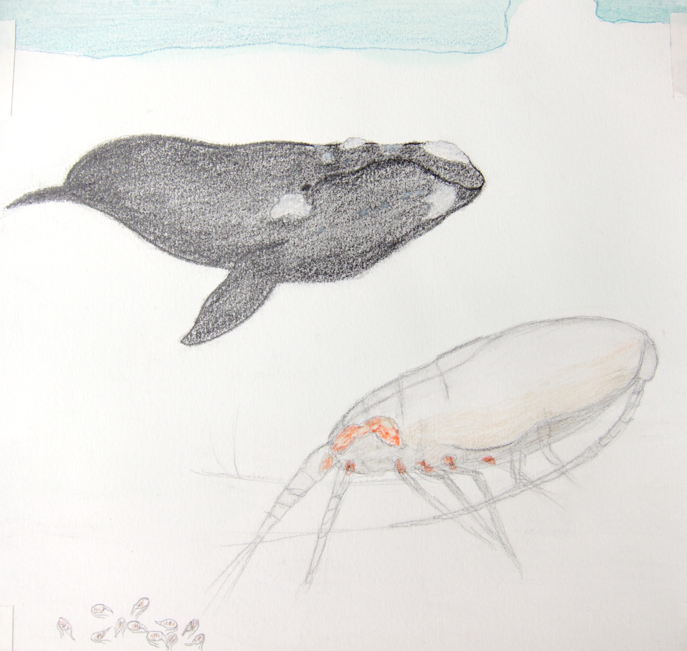 Michael Mangalo May 26, 2014 Wow! I think it’s really cool how with just a piece of paper, a coloured pencil, and graphite, you can show the similarities between two creatures that are so drastically different in size! What exactly is a copepod and why did you choose to portray these creatures next to this enormous bowhead whale? Reply