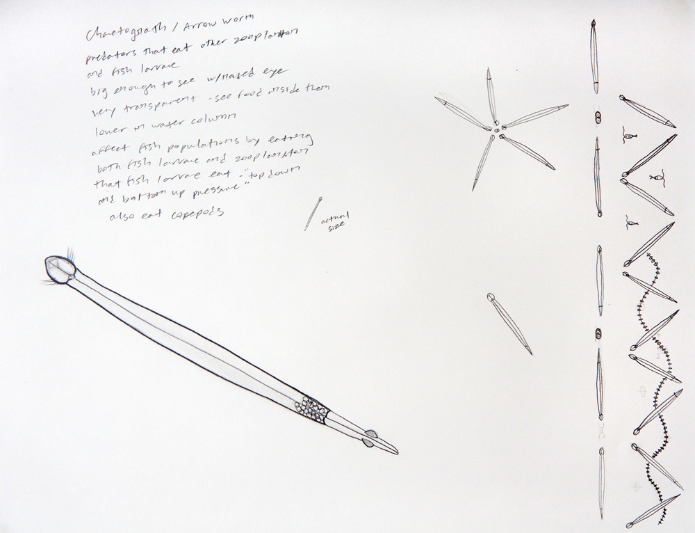 Graphite Chaetognaths or arrow worms are predatory zooplankton that eat copepods and other smaller zooplankton and also fish larvae. They are large enough to be seen by the naked eye, but they are still very small and very transparent. I got to actually see live copepods and chaetognaths in the microscope thanks to biologist Carin Ashjian! Leave a Reply Cancel Reply Your email address will not be published. Name* Email* Website Comment Notify me of follow-up comments by email. Notify me of new posts by email.