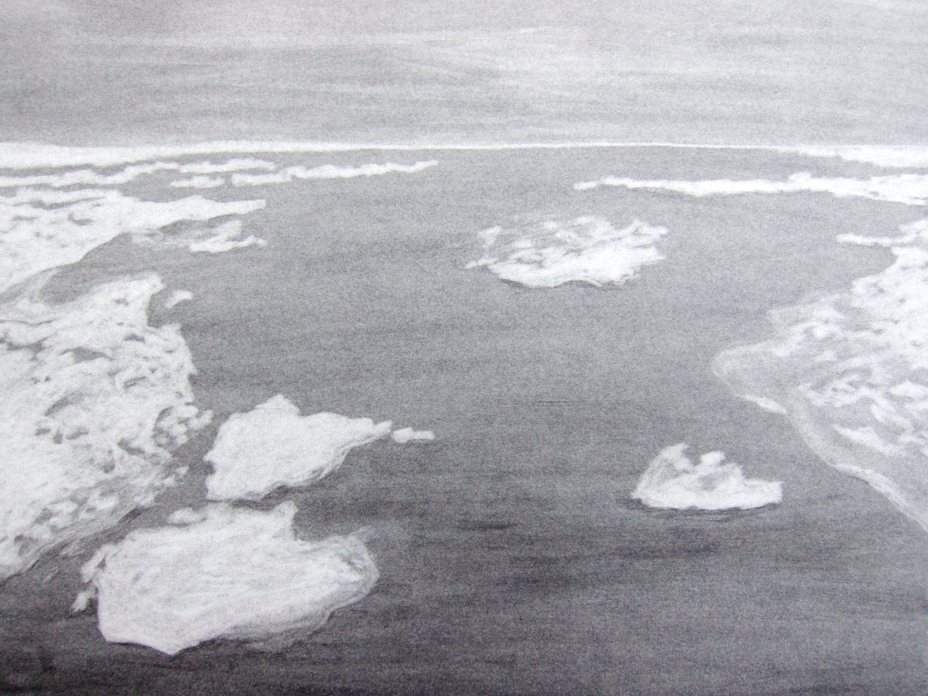 Graphite I meant to draw some walruses in preparation for the first of my larger food chain pieces today, but I just couldn’t tear myself away from the ice. I have a spot where I can sit in the bridge with a perfect view of the ice and it’s just so nice to sit there and erase ice floes while keeping an eye out for polar bears. This piece is also drawn with an eraser on a piece of paper toned all over with graphite. 2 Responses Luisa May 28, 2014 Hi Chelsea! I love this drawing. I think it’s super cool that the base of the drawing is in graphite, and that you erased to draw out the ice floes. Where did you draw this? Its a really beautiful location. I noticed you said you keep an eye out for polar bears, and I was wondering if you saw any other wildlife in this location. Do you ever see fish or birds here? If there are polar bears, there must be some kind of food chain. Reply Chelsea Clarke May 31, 2014 Hi Luisa! Thanks for the compliment! I’m actually not sure exactly where I drew this. Out in the middle of the sea ice it gets hard to tell where you are except by latitude and longitude, so all I can tell you is that it’s in the Chukchi Sea somewhere. There are a lot of birds here, mostly kittiwakes and other gulls, and we’ve also seen snow buntings. I haven’t actually seen any fish, but I’m sure they are there under the ice, we just can’t see them. There are also a lot of seals, which eat the fish and are the main food for the polar bears. Reply Leave a Reply Cancel Reply Your email address will not be published. Name* Email* Website Comment Notify me of follow-up comments by email. Notify me of new posts by email.
