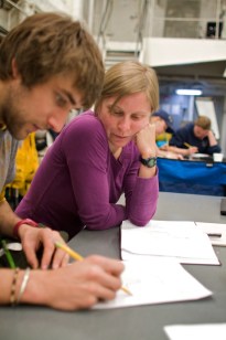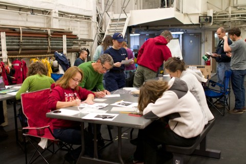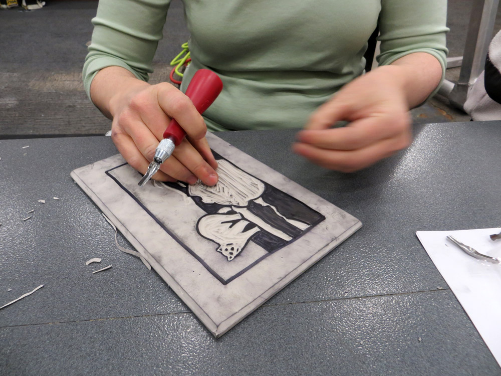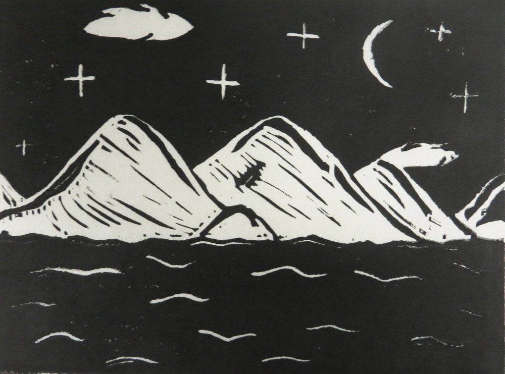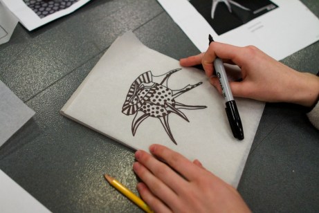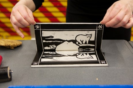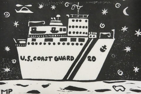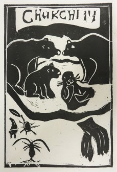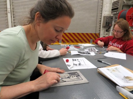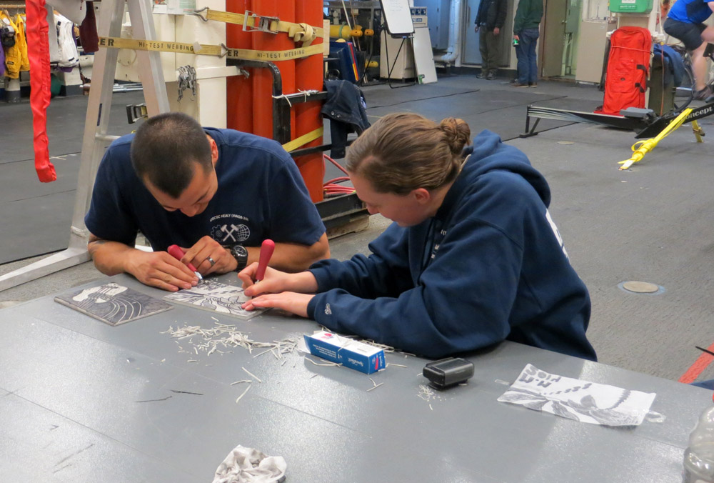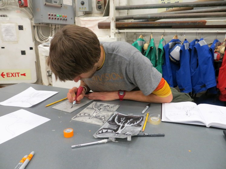 I have been teaching linoleum block printmaking workshops to the science party and some of the crew on the Healy for the past couple of weeks and it’s been surprisingly popular and very successful. The process involves making a drawing, transferring it to a rubber block (it’s called linoleum but it’s nothing like the kind on the floor), and using small carving tools to carve out all the white areas in the drawing. Once the block is carved it’s basically a giant rubber stamp and you use a roller to roll ink over the surface so that the un-carved areas get covered in black ink and the carved away areas remain white. Then you print the block by placing the paper on top of the inked block and rubbing the back of the paper with a tool called a baren which uses pressure to transfer the ink from the block to the paper. Preparing and carving the block is a time consuming and tricky process, but once the block is finished you can make many prints from the same block. Today was the science morale dinner on the ship and we hung up the prints from the workshops and had a little art show. Possibly the first ever art show onboard the Healy! I’m very impressed with the results, especially considering that most of the participants had no printmaking experience at all. I wasn’t expecting so much interest in printmaking, but I think people really enjoyed the break from the usual routine and the chance to make something personal to take home. Sophie RenautPierre CoupelMaria PisarevaKevin ArrigoCaroline GuilmetteJesse TorresJoannie FerlandHannah Joy Warren One Response erin curtis June 17, 2014 Wow..what great pictures..and the details are amazing. Thank you for posting..it was fun to see. Reply Leave a Reply Cancel Reply Your email address will not be published. Name* Email* Website Comment Notify me of follow-up comments by email. Notify me of new posts by email.
