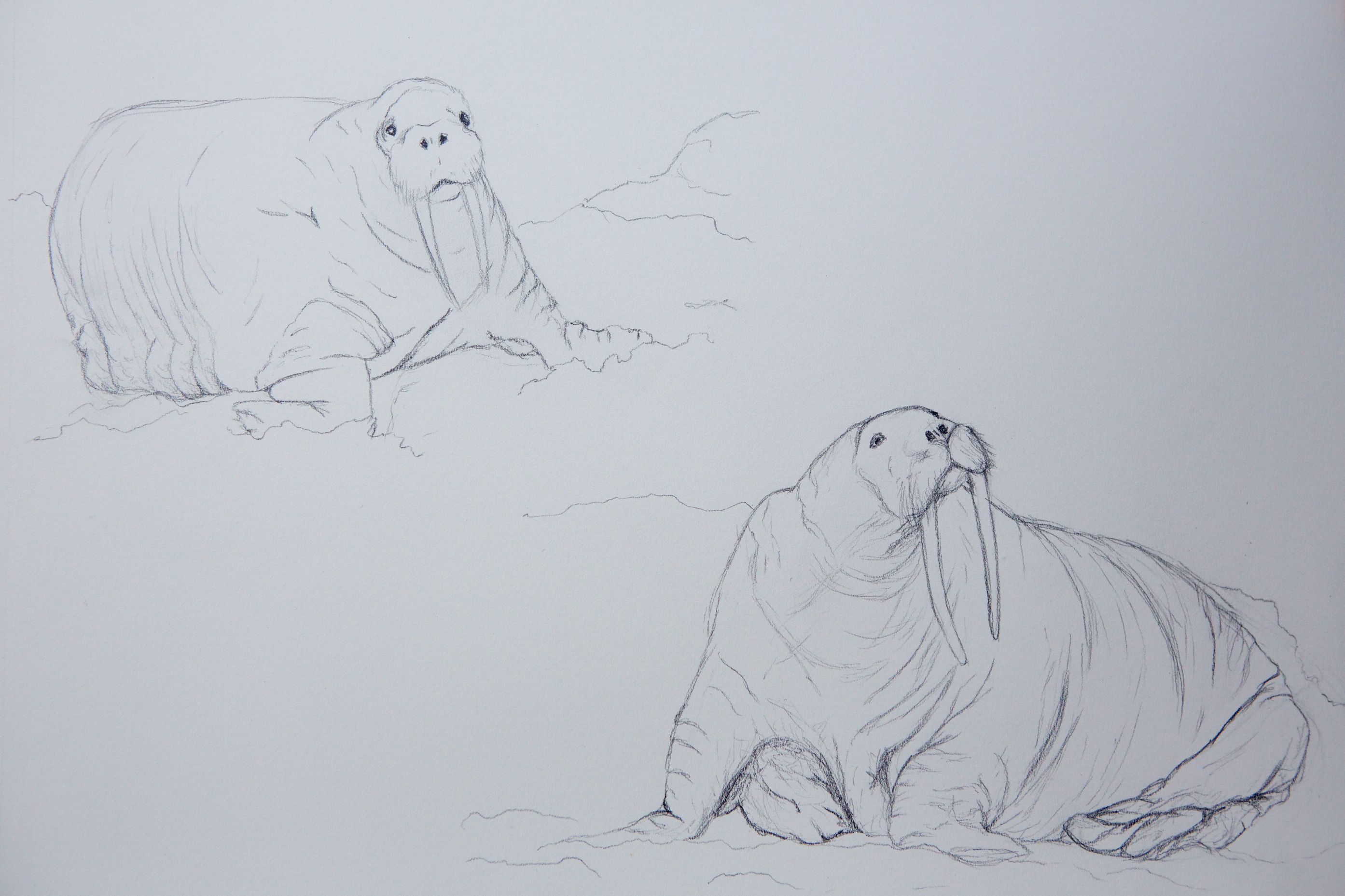 Graphite Part of my plan for the larger body of work I want to make based on this cruise is some pieces about the arctic food chain. I want to show how even the biggest arctic animals such as polar bears, walruses, and whales are still completely dependent on the tiny phytoplankton for survival. Today I started drawing walruses in preparation for a larger walrus food chain piece. I use these small studies to learn about walruses and how their bodies look and move so that I will be more familiar with them when I do the large piece. I also use the studies to test out different compositions and walrus poses to get a better idea of what will look good. Drawing from observation requires a really intense level of looking and is a good tool for me to learn about my subjects just by observing every detail so closely. In that way art is a lot like science, l am learning about the world around me through very close, very focused observation of it, I’m just using a different set of tools to record my observations. 2 Responses Oliver Russell May 29, 2014 I really love how much character these Walruses seem to have! Have you seen many Walruses on the ice? I know that they stay closer to coastal ice, but have you passed large groups on your way further north? Reply Chelsea Clarke May 31, 2014 Thanks! We did pass a lot of walruses on our way north! No huge groups, but quite a few smaller groups of 3 or 4 at a time lying on the ice floes. We even saw a baby in one group! You’re right about them staying closer to the coast, so now that we’re so far out to sea and so far north in the solid ice we haven’t seen them lately, but I hope we see more on our way back down at the end of the trip. Reply Leave a Reply Cancel Reply Your email address will not be published. Name* Email* Website Comment Notify me of follow-up comments by email. Notify me of new posts by email.
