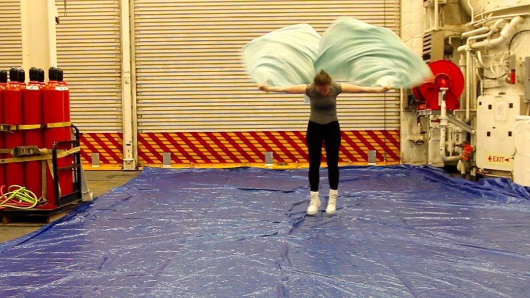 Finding adequate rehearsal space in NYC is tough. In March and April while preparing for Polar Vortex, my dancers and I rehearsed in seven different locations. So, imagine my joy aboard USCG Healy where, as the only choreographer amongst a pod of scientists, I’ve commandeered the helicopter hangar as my workspace. Prior to launch in Dutch Harbor, I purchased a 40’ x 30’ tarp that is my portable dance-floor. A deep blue, it suggests a tropical pool mysteriously lurking on this ice-cutter. The air temperature, however, is distinctly Arctic. I warm myself up thoroughly in the gym (The Healy has two!) then unroll my tarp and deliriously bound, lunge, lean and roll. As the crew is fond of saying, The Healy is a remarkably stable vessel—a flat bottom and an internal water flume are just part of the complex engineering that keep its roll to a minimum. That said, a certain amount of rocking is inevitable on the sea — the unpredictable tilt of the floor adds a fun challenge to balancing. Even more delightful are the jostling rumbles as we plow through the ice. I share the hangar with Sigrid Salo, an oceanographer with NOAA, who sets a weather balloon aloft daily at 4am and 4pm. At first, when she calmly laid a sheet beside my tarp and blew up her balloon, I was afraid I might accidentally swerve off-balance and puncture it with my sticks (part of my costume), but she was unconcerned. Yesterday, when Sigrid set the balloon aloft on the helipad, it took off, dipped a little and did a swirly dance on the way back up. I took the balloon as inspiration for a bit of twirling and leaping of my own, to the amusement of some crew members who were out grilling meat for our Saturday night Hawaiian Luau. Ah, the joy of a well-timed atmospheric gust. Leave a Reply Cancel Reply Your email address will not be published. Name* Email* Website Comment Notify me of follow-up comments by email. Notify me of new posts by email.