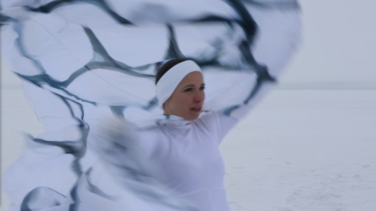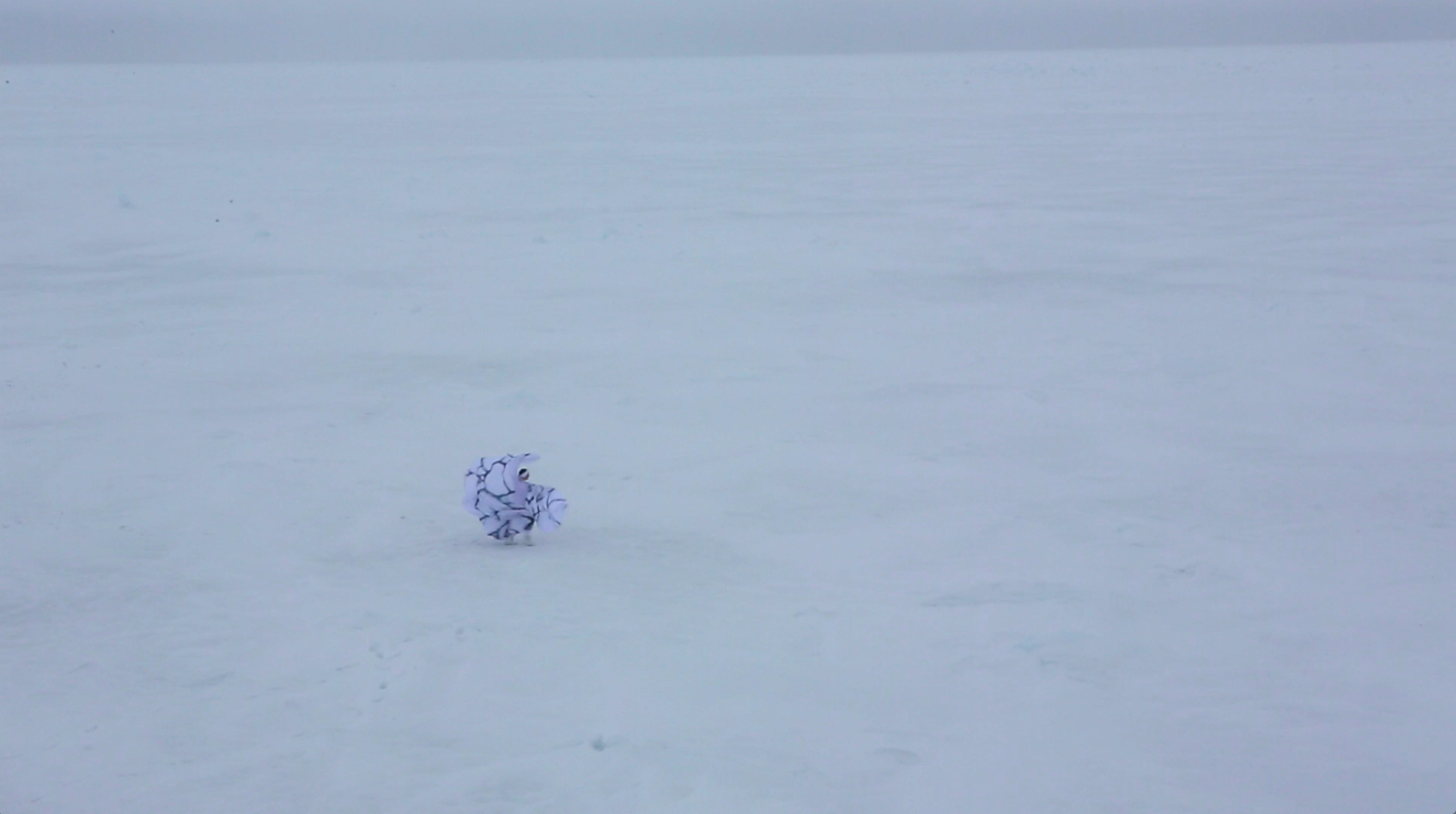 When I left off in Ice Station Practice, I was awaiting a dancing-on-the-ice shoot with outreach team documentarians Ben Harden and Amanda Kowalski. For the first two weeks of the cruise, we had been alternating days on and off the ice. When the next ice station day arrived, the weather turned out to be particularly bitter cold and windy. That morning, every person I encountered asked me with concern if I intended to dance outside. Ben, Amanda and I decided to postpone shooting until the next opportunity. The following station turned out to be three (not two) days later and was an occasion for “ice liberty” — a chance for everyone who doesn’t have science “ops” on the ice to go outside and play, literally. Lots of fun, but probably not the best day for a shoot unless you want Coast Guard crew as extras. Ok, now I was starting to get antsy. On June 3, The Healy glided up to an ice floe and parked for three days. This was a chance for the science team to observe changes in one particular floe over a period of time. We were expecting the melt ponds to arrive and were eager to witness the ice-scape’s transformation. Unfortunately for me — and more unfortunately for scientists — it snowed. The Arctic is somewhat of a desert with little annual precipitation so the storm was a surprise. The snowfall whitened the darkening patches and forestalled the “albedo feedback” (see ICE WATCHING post) which leads to the formation of melt ponds. Nonetheless, unsure of what the future conditions for ice dancing would be, we decided to go ahead with a shoot. The miserable weather made me feel heroic. Here I was leaning into the wind, dancing in an Arctic squall, staggering through crunchy slush and getting pelted by large wet snow flakes. The wind kept tangling my costume. I wiped out a few times. In near “grey-out” conditions, Amanda and Ben stoically recorded me in an array of wide-angle and close up shots. By shoot’s end, I was utterly exhausted, freezing and also strangely exhilarated. Later, after a hot shower and tucked under several blankets, with warm blood slowly making its way towards fingers and toes, I felt the satisfaction of having done something that no one has ever done before (and few could possibly be so foolish as to try). This was dancing in the Arctic! I couldn’t wait until the next time. And there would turn out to be many more next times. [To be continued] Leave a Reply Cancel Reply Your email address will not be published. Name* Email* Website Comment Notify me of follow-up comments by email. Notify me of new posts by email.