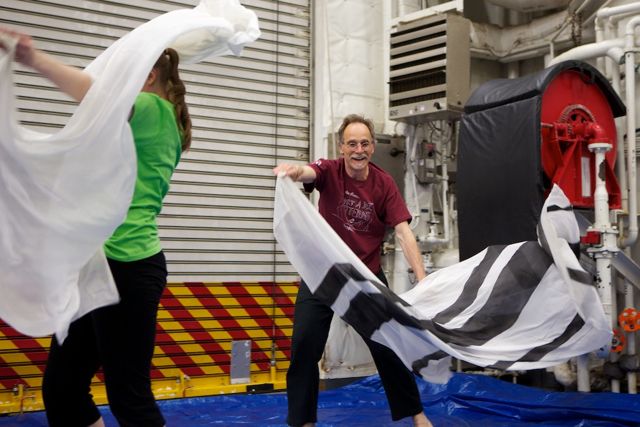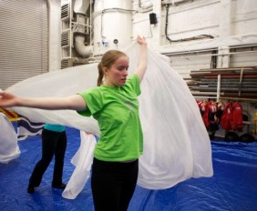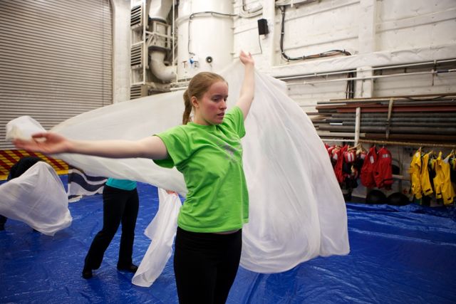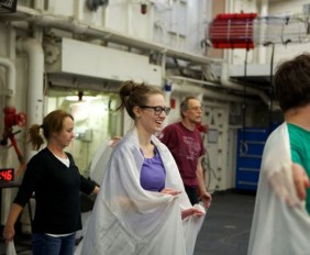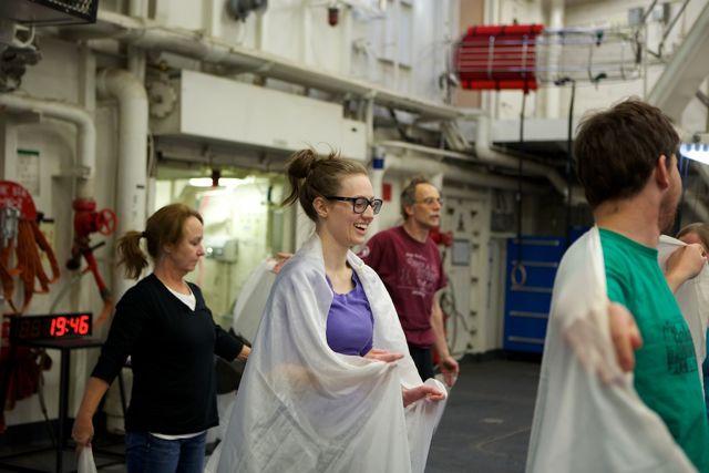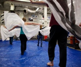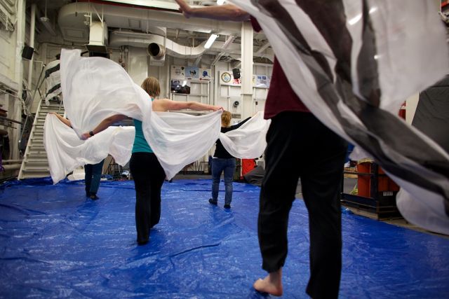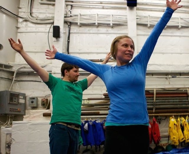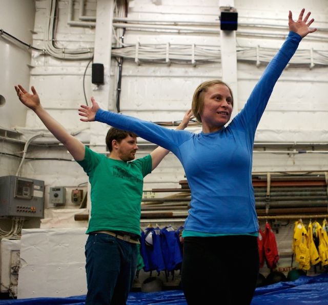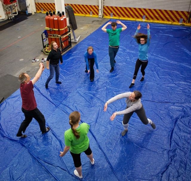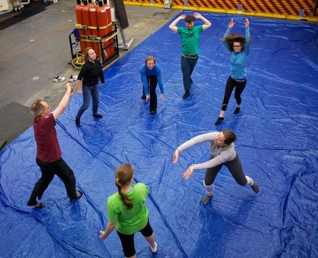 Time Lapse Dance Workshop Jody Sperling May 28, 2014 Dance 1 Comment The science team aboard the Healy has been incredibly generous in giving me impromptu tutorials in such topics as sea ice composition, melt pond mathematics, ice algae bio-markers and zooplankton reproduction. In return, I had the opportunity to teach a workshop in “Time Lapse Dance” technique. We broke the ice (so to speak) by practicing bumping into each other — an inevitability with the ship’s motion and a quick exercise in Brownian motion. Along the way we enjoyed some shipboard spinning and ended the class by dancing with floating fabric. One Response Donglai Gong May 29, 2014 Looking good Frank! I look forward to the actual performance on ice. Reply Leave a Reply Cancel Reply Your email address will not be published. Name* Email* Website Comment Notify me of follow-up comments by email. Notify me of new posts by email.