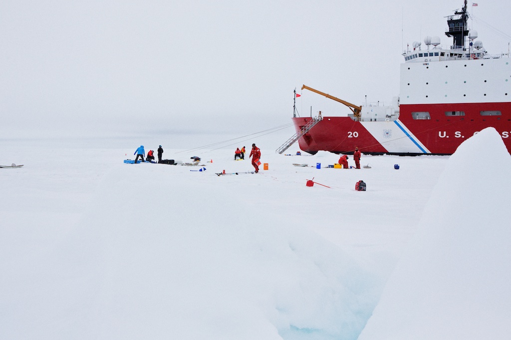 A typical day’s work on the frozen sea. Even before we’d cleared the Bering Strait northbound, people started asking Chris when the melt ponds would appear. “June third,” he said without missing a beat. “Yeah? What time?” He’s worked on the Greenland Ice Sheet, Antarctica, and all over the western Arctic sea ice, so when he talks melt, we listen; my money was on him. But then yesterday nature interceded, as it’s wont to do, the wind shifted, and it snowed, re-enhancing the albedo. “Hardest I’ve ever seen it snow in the Arctic,” he said. (There’s seldom enough moisture in the Arctic air to snow.) Of course, no one can know precisely, given wide natural variability, but there are signs: The snow has turned slushy, granular, corn snow, I think skiers say, and through it grey patches appear here and there that one imagines might become melt ponds in a day or so. Anyway, you don’t have to be a pro to tell that change is upon us. Further, the water column is well mixed, full of the fertilizer phytoplankton relish. The annual Arctic explosion of life is cocked and ready—light will soon ignite the short fuse. And if the scientific suppositions on which this expedition was founded and funded are correct, first light will shine through those melt ponds. Soon. The mess-deck mood tonight was more jovial than usual; I wonder if that was why. When traveling, the Inuit (the “People”) were often thirsty, but eating snow was no remedy because it lowered body temperature. The melt ponds offered a slacking source of fresh water—they called them piqaluyak. In the animistic spirit world of the Inuit, the seal willingly relinquishes its life that the people might survive. In thanks and propitiation, they ritualistically give the dead seal a drink of piqaluyak water before butchering it. Chris Polashenski, ice scientist, and Rebecca Molinari, ice safety officer, wrapping up another ice deployment. Change in the air, the brain trust has decided to stop the ship for three days in order to measure repeatedly ice, light, and life. I watched from the “aloft con,” the ice-piloting position atop the bridge some 90 feet above the waterline, as the chain of command, considering wind direction and ice conditions, directed the ship drivers to nose Healy into a substantial floe flat as a dance floor. There, at 71°35’N x 166°21’W, they parked her. But nothing on sea ice remains truly stationary. We’re drifting north-northeast at a half knot under the behest of a southerly breeze that, the assumption is, will prompt further melting. The scientists worked all day, came aboard wet and a little haggard looking for dinner, then went back out on the ice for several hours. Now that we’re stationary, they leave their heavy, unbreakable, and safely packed gear out on the ice. The foot of the brow is craned about four meters above the ice to discourage uninvited dinner guests. At midnight, with scattered gear abandoned under a soggy fog, the scene looked like the aftermath of a skirmish in a dystopian melodrama. This morning’s sky is leaden, monochromatic except for a thin layer of cloud the color of coal smoke lying close above the horizon. A steady drizzle leaves puddles on the 01-deck, portside, from which I watch the scientists and the Coasties sink suddenly shin-deep in wet snow en route back to their research stations. Has yesterday’s excited mood on the mess deck faded to a kind of head-down resolve? Chris holding “melt grain clusters” that suggest the onset of the melt back. Is it the anticlimax of premature expectation, or is it just that the fog and the rain make it seem so? Also, it just occurs to me, there’s the unaccustomed silence. For the past two weeks, Healy has been bashing and crashing, displaced ice grating along her hull plates, reverberating through her innards as if she were perpetually going aground on bouldered bottom. Now even her generators seem subdued. Or maybe I project. Watching Carolyn, toting her radio spectrometer, fade into the fog at the far end of her transit, bear guard beside her, I was reminded what a strange little microcosm we live in (like Western-movie towns, ships in their isolation make good microcosms). Research vessels are literally and figuratively divorced from shoreside reality. We don’t shop, cook, or wash up for ourselves after meals. Focus on the work is utter, distractions minimal. Sure, everyone’s a careerist, even writers, but while it lasts, before the papers need to be written, data parsed and explicated, while the real-world decisions, day-to-day pressures, and personal obligations hang in abeyance, everyone helping and looking out for each other, it feels, someone on another ship once said, like science camp for adults. And then suddenly, as the dockside heaving lines arc over the rail, it ends. But, then, I’m not a scientist, only an observer of science in action. Maybe I’m alone in that view. At lunch I wondered aloud what happens should the melt ponds not appear by Friday at 1200? “Don’t ask that question,” said Bob only half kidding. Oh. Okay. So we’ll wait for the window to open, let the light in. I’ll keep you posted. My thanks to Jason Christensen The return of “winter” just when we thought the melt had arrived. One Response jonathan Russo June 12, 2014 I have just finished reading several of Dallas Murphy’s “dispatches” I know Mr. Murphy from his previous books about the natural world. These posts are in that same vein. They are very well written and vividly convey the importance of the work being conducted. Each post adds and builds up the flavor of this fascinating Arctic voyage. Thanks Mr. Murphy for the great insight and quality writing. Reply Leave a Reply Cancel Reply Your email address will not be published. Name* Email* Website Comment Notify me of follow-up comments by email. Notify me of new posts by email.
