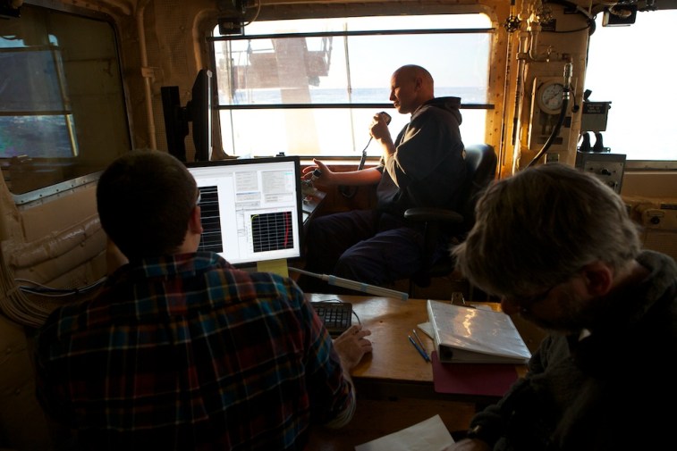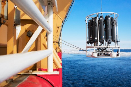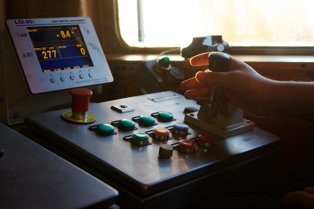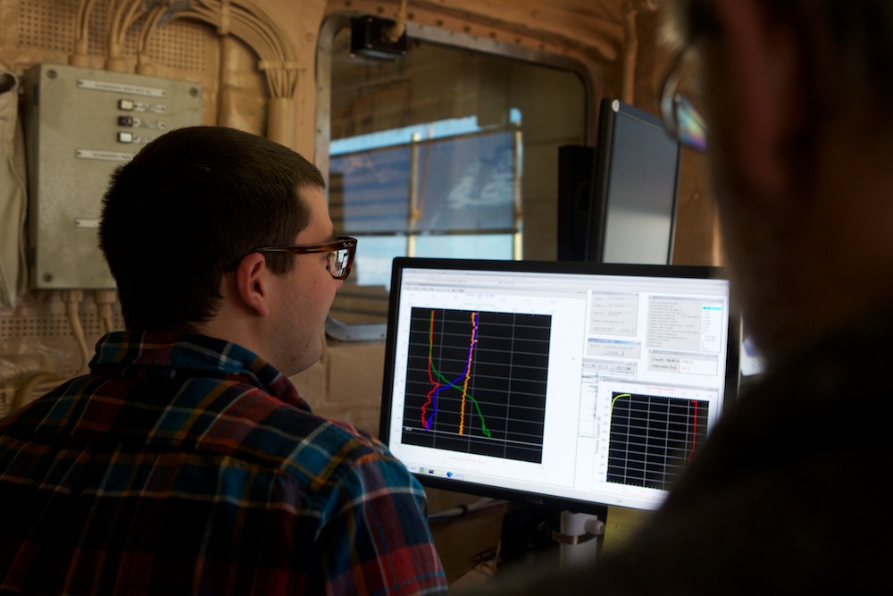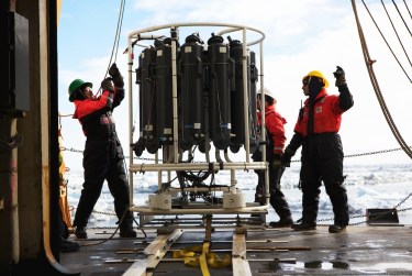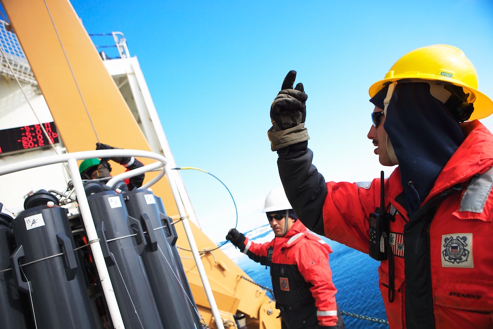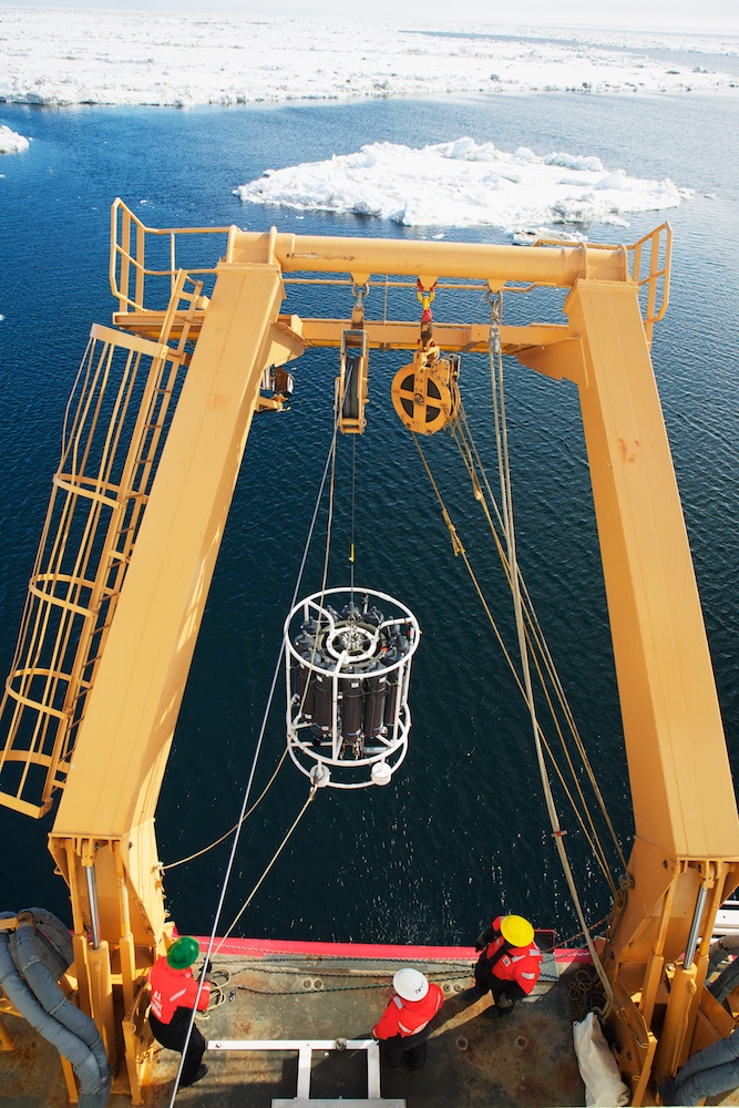 The CTD (standing for Conductivity-Temperature-Depth) is a vital tool for oceanographers. It measures the temperature and salinity of the water as it is lowered from the surface to the sea floor. By repeating this processes in many places, the team can build a picture of the water in the Chukchi Sea and where certain currents are flowing. The sensors that measure these properties are hidden in the center of the CTD rosette – around the side, 12 bottles collect water samples at different depths. The team monitoring the cast in the control booth can both see the data collected by the CTD in real time and remotely trip the bottles to collect their samples. These water samples are used for many of the biological measurements and experiments aboard. In addition, this CTD is also equipped with a fluorimeter to measure the amount of chlorophyll in the water and also the transmissivity to measure how murky the water is – an indicator of how much sediment or other planktonic activity there is. 2 Responses Claire Pickart June 20, 2014 Thanks Amanda for these photos and article on the CTD! We have heard alot about it over the last few weeks from our son, Will. He has had the time of his life. Claire Pickart Reply amanda@amandakowalskiphoto.com June 24, 2014 Hi Claire, Will has been a total joy to work with and befriend. He is a great guy! Thanks for your comment on the gallery. -Amanda Reply Leave a Reply Cancel Reply Your email address will not be published. Name* Email* Website Comment Notify me of follow-up comments by email. Notify me of new posts by email.