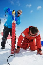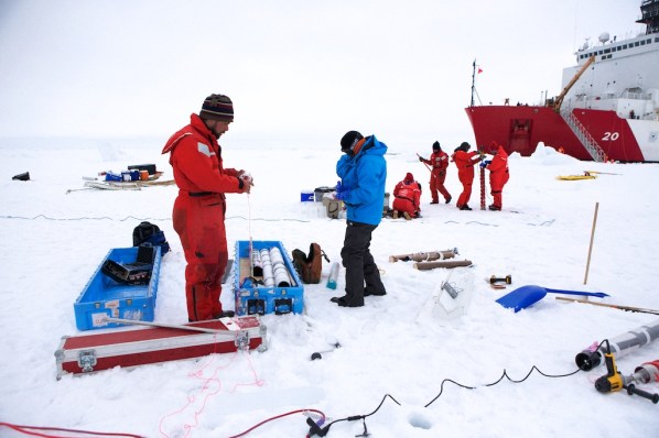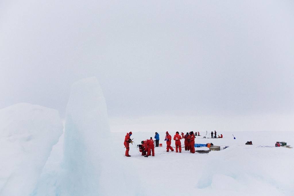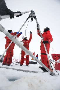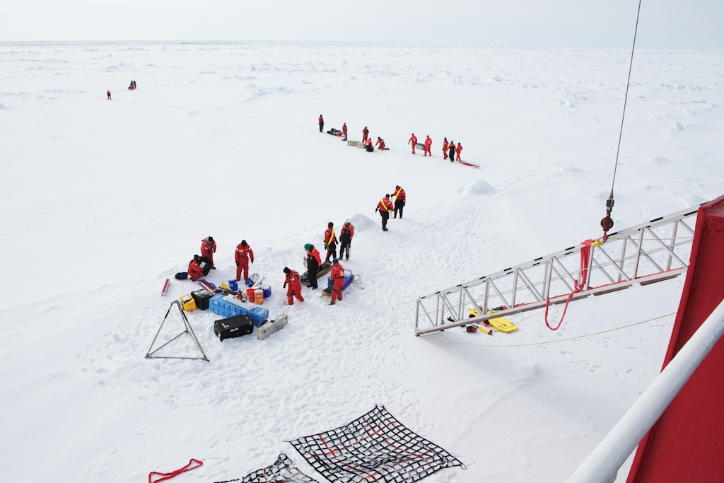 Science on Ice: Some people are drilling holes in the ice to learn what’s going on beneath it, others taking ice core samples to learn what’s in it, still others netting plankton from the seawater. This is the collection phase. The analysis phase will go on around the clock in shipboard labs. This is a caption Read Dallas’ account of our day on the ice! One Response Scientific Labor » Arctic Spring May 30, 2014 […] Ice Day […] Reply Leave a Reply Cancel Reply Your email address will not be published. Name* Email* Website Comment Notify me of follow-up comments by email. Notify me of new posts by email.